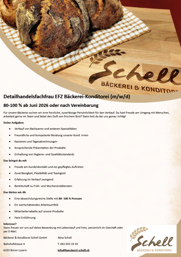 Jede/r Mitarbeiter/in hat seinen Platz in unserem Team verdient und trägt ihren/seinen Teil zur Bäckerei & Konditorei Schell bei. Wir fördern und fordern Wissen und deshalb unterstützen wir unsere Mitarbeiter/Innen bei Weiterbildungen. Nur gemeinsam können wir Grosses schaffen und unseren Kunden jeden Tag mit einem Lächeln begegnen.